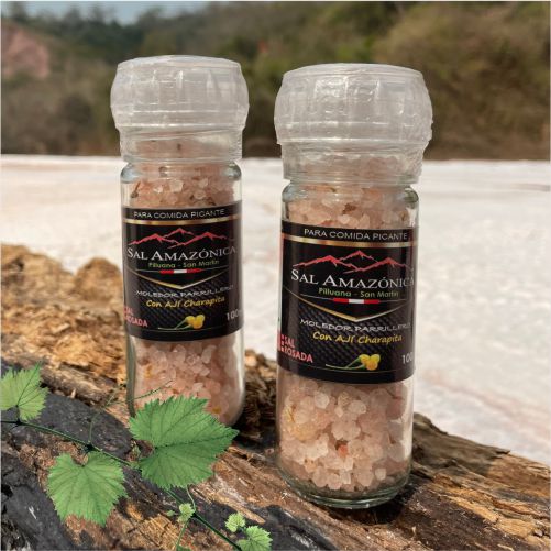 " Al comprar este producto, contribuyes con el desarrollo de la comunidad del valle del Mishquiyacu, distrito de Pilluana, provincia de Picota, región San Martín - Perú ".Moledor con Ají Charapita - Sal Rosada