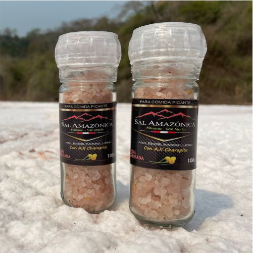" Al comprar este producto, contribuyes con el desarrollo de la comunidad del valle del Mishquiyacu, distrito de Pilluana, provincia de Picota, región San Martín - Perú ".Moledor con Ají Charapita - Sal Rosada